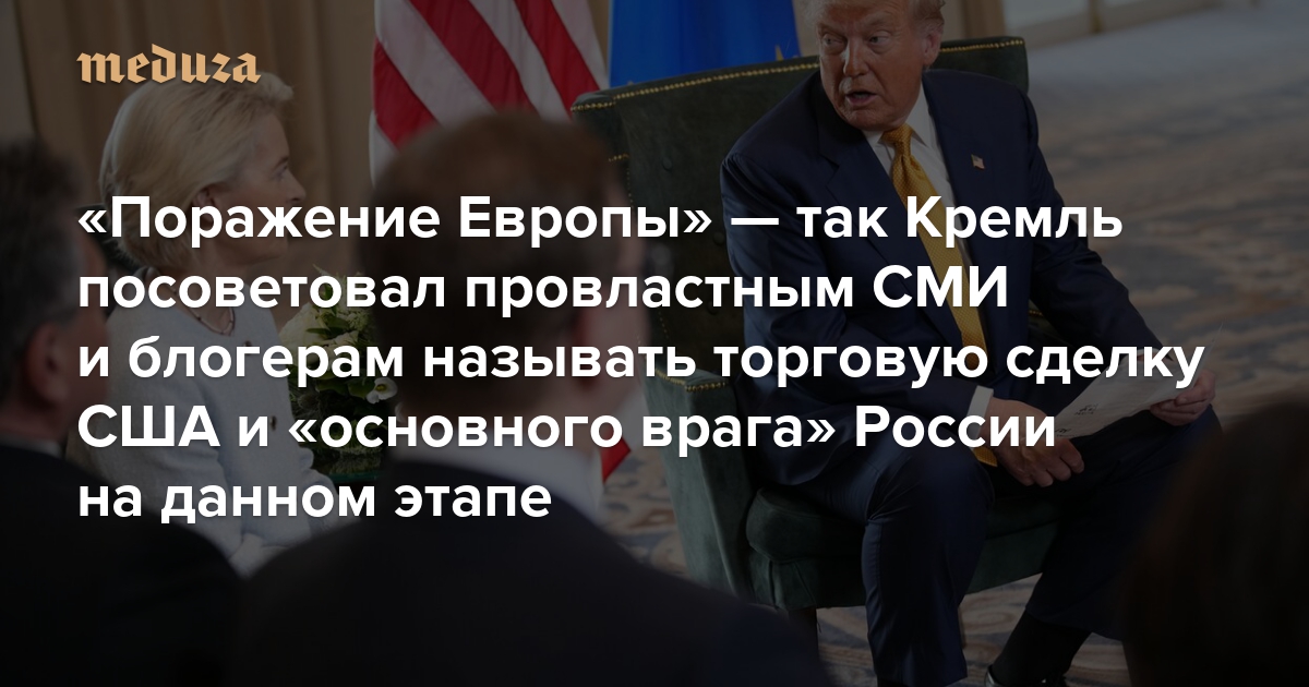 «Поражение Европы» — так Кремль посоветовал провластным СМИ и блогерам называть торговую сделку США и Евросоюза Главное — рассказать россиянам, что «у основного врага все еще хуже, чем у нас»