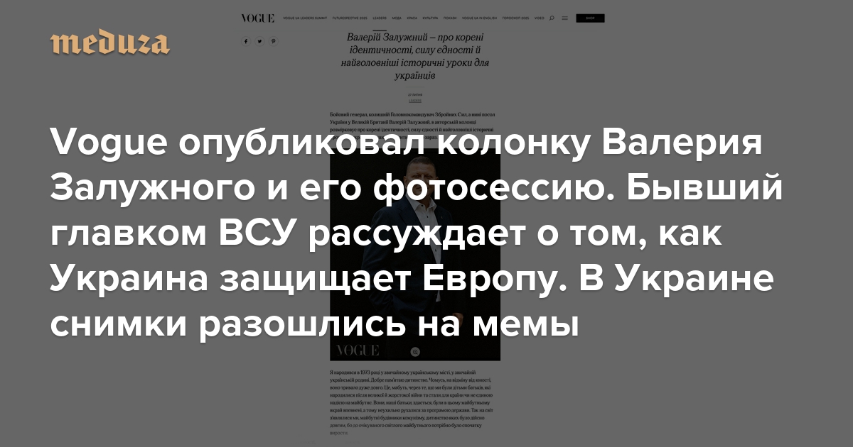 Vogue опубликовал колонку Валерия Залужного и его фотосессию. Бывший главком ВСУ рассуждает о том, как Украина защищает Европу В Украине снимки разошлись на мемы. Российская пропаганда исследовала пуговицы генерала