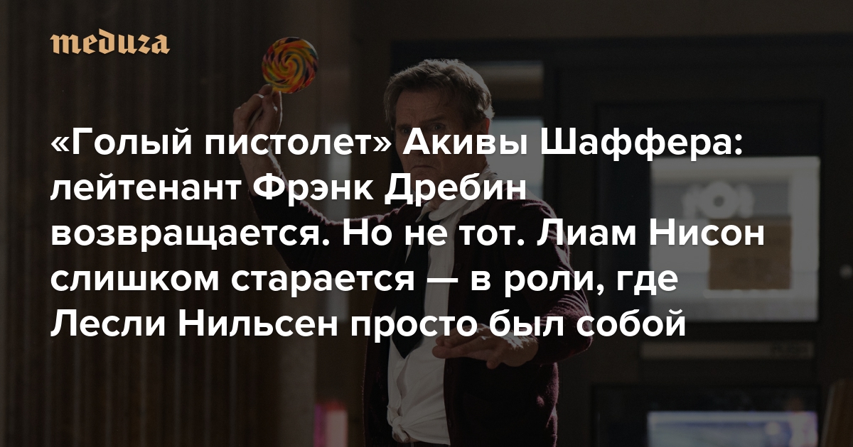 В прокате — «Голый пистолет» Акивы Шаффера, комедийный боевик, который продолжает серию фильмов о лейтенанте Фрэнке Дребине, начатую в 1988 году Джимом Абрахамсом и братьями Джерри и Дэвидом Цукерами. Исполнитель главной роли Лесли Нильсен умер в 2010 году; в продолжении Фрэнка Дребина играет Лиам Нисон, его персонаж — сын героя оригинальной трилогии. Кинокритик Антон Долин рассказывает, почему создатели нового «Голого пистолета», при всем их пиетете перед старыми фильмами, проглядели там самое важное.
