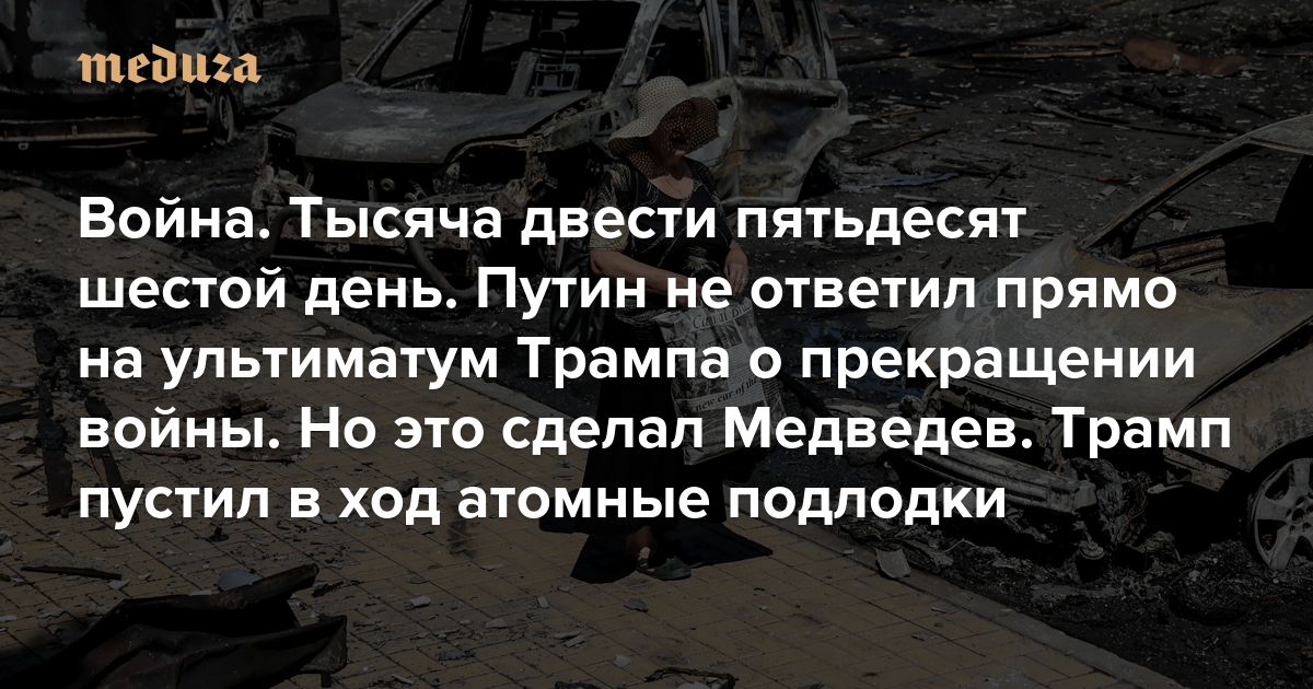 Война Тысяча двести пятьдесят шестой день. Путин не ответил прямо на ультиматум Трампа о прекращении войны. Но это сделал Медведев. Трамп пустил в ход атомные подлодки