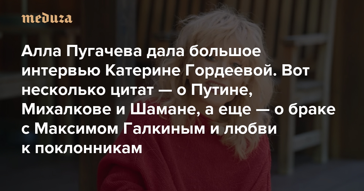 Алла Пугачева дала большое интервью Катерине Гордеевой Вот несколько цитат — о Путине, Михалкове и Шамане, а еще — о браке с Максимом Галкиным и любви к поклонникам. «Ребята, научитесь говорить правду»