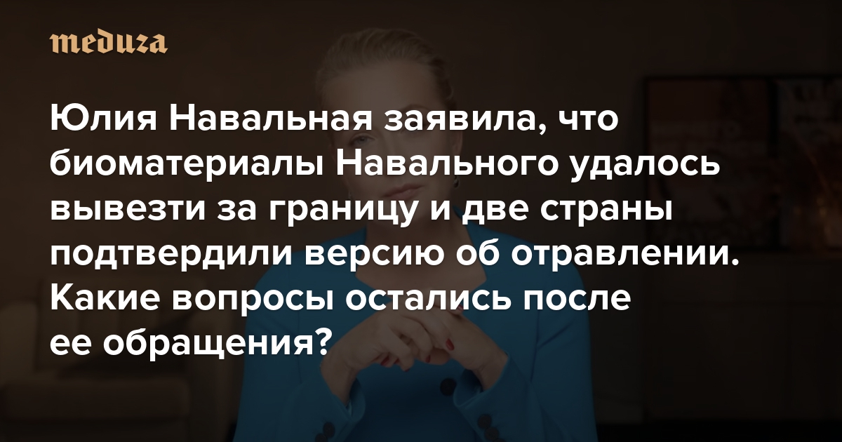 В расследовании убийства Навального случился прорыв. Юлия Навальная в специальном видеообращении заявила, что ее команде удалось получить биоматериалы Навального и переправить их за границу. Их изучали две лаборатории в разных западных странах, и обе подтвердили версию об отравлении. Однако подробнее об этом Юлия Навальная рассказать не может, поскольку лаборатории не делятся с ней результатами экспертизы по неким «политическим соображениям». Несмотря на множество новых деталей, обращение Навальной порождает новые вопросы. «Медуза» постаралась сформулировать три главных.