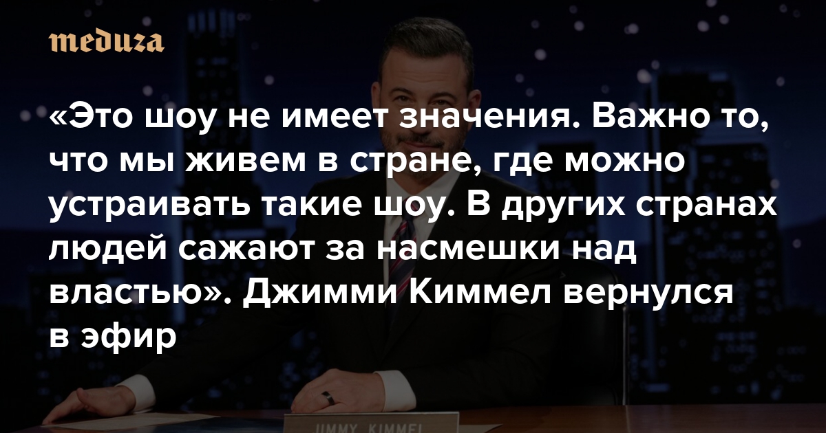 «Это шоу не имеет значения. Важно то, что мы живем в стране, где можно устраивать такие шоу. В других странах людей сажают за насмешки над властью» Джимми Киммел вернулся в эфир. Он выступил с эмоциональной речью в защиту свободы слова