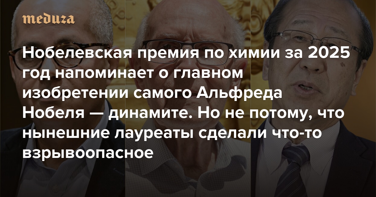 Альфред Нобель, как известно, изобрел динамит. А на деньги, вырученные от его производства и продажи, основал премию своего имени. В 2025 году эту премию в химической номинации присудили Сусуму Китагаве, Ричарду Робсону и Омару Ягхи, которые, по сути, воспроизвели изобретение Нобеля — хотя и на совсем ином научном и техническом уровне.
