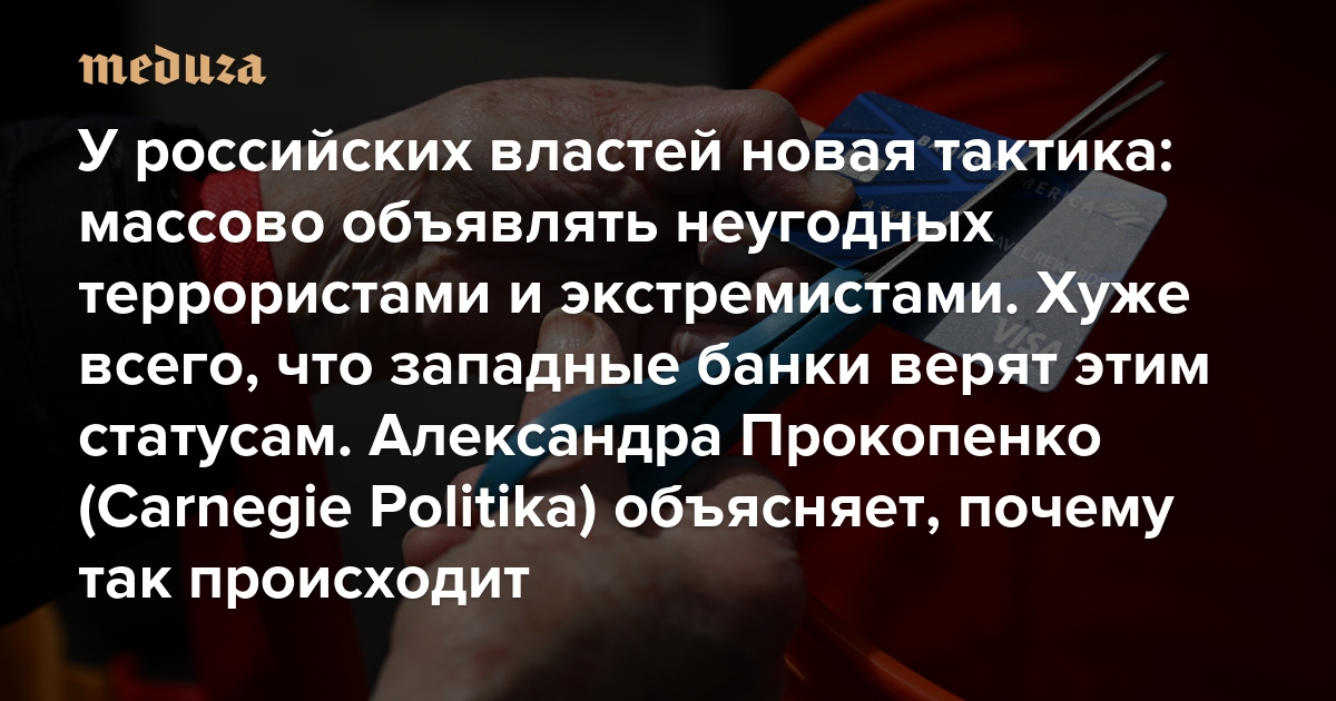 У российских властей новая тактика: массово объявлять неугодных террористами и экстремистами Хуже всего, что западные банки верят этим статусам. Александра Прокопенко (Carnegie Politika) объясняет, почему так происходит