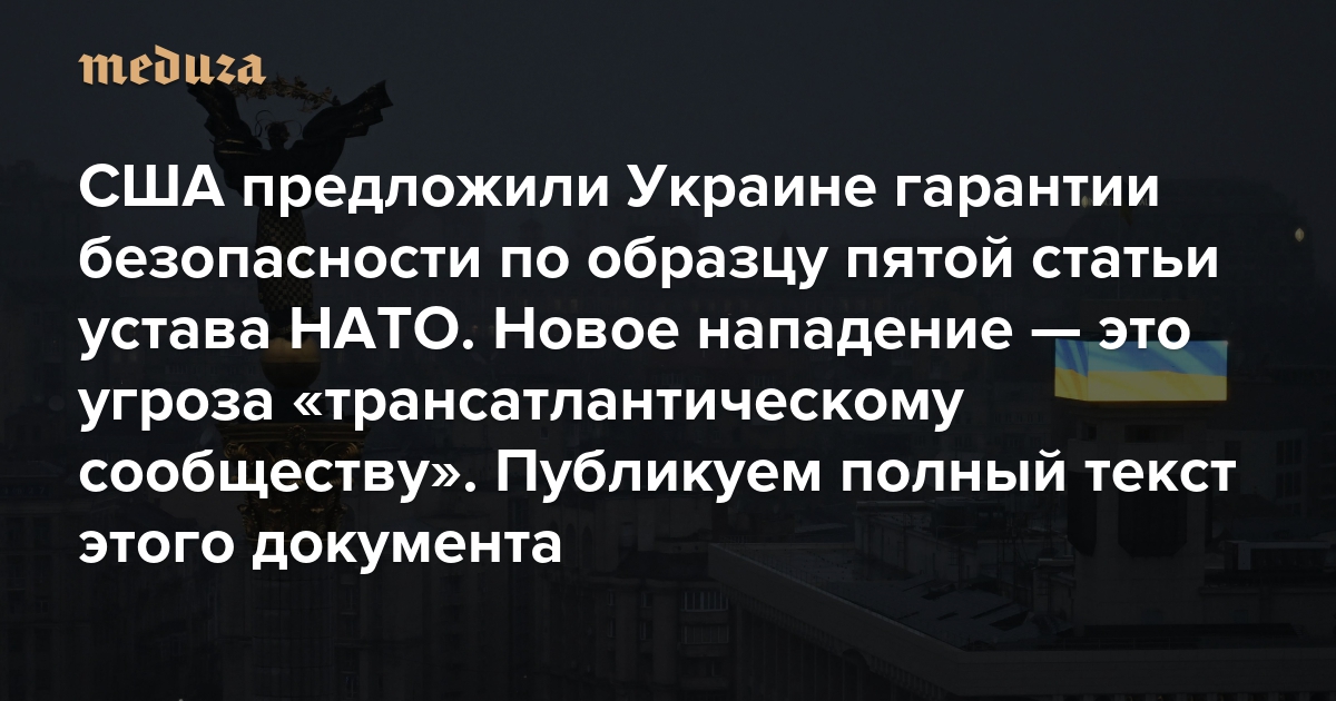 США предложили Украине гарантии безопасности по образцу пятой статьи устава НАТО Новое нападение — это угроза «трансатлантическому сообществу». Публикуем полный текст этого документа