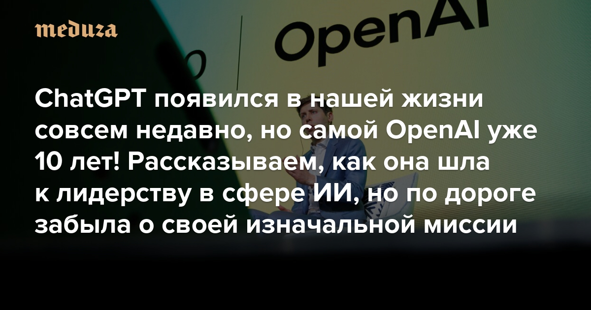 11 декабря 2025 года американской компании OpenAI исполнилось 10 лет. Сотням миллионов людей она известна как разработчик ChatGPT — чат-бота, ставшего незаменимым помощником в любых делах: будь то пересказ сложного текста, выбор диеты или планирование дня рождения. Многие воспринимают команду OpenAI как гениев-благодетелей, которые сделали реальностью то, о чем мечтали целые поколения. В то же время OpenAI все чаще сталкивается с обвинениями в свой адрес из-за слишком вольного обращения с авторским правом или выпуска недоработанных продуктов. Однако самая главная претензия в том, что компания изменила своей первоначальной миссии: развивать искусственный интеллект, не фокусируясь на финансовой выгоде. «Медуза» рассказывает, как изменилась компания за эти годы и почему мир ее любит (и в то же время ненавидит).