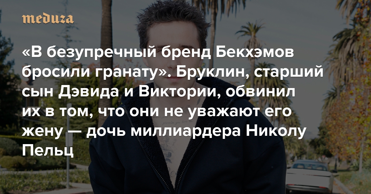 «В безупречный бренд Бекхэмов бросили гранату» Бруклин, старший сын Дэвида и Виктории, обвинил их в том, что они не уважают его жену — дочь миллиардера Николу Пельц. Этому конфликту уже много лет — рассказываем главное о нем