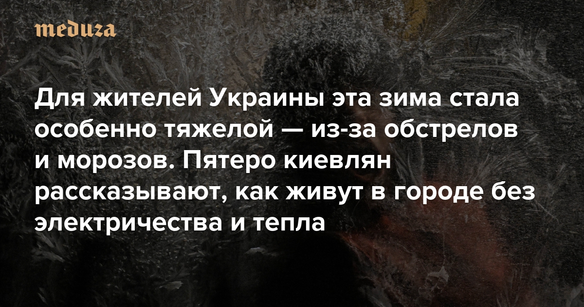 Из-за массированных ударов российской армии по электростанциям и распределительным сетям жители украинских городов замерзают: в их домах с начала года почти нет электричества, тепла, а где-то даже воды. Особенно пострадали Харьковская, Черниговская, Сумская, Одесская, Днепропетровская, Запорожская области, Киев и Киевская область. По словам мэра столицы Виталия Кличко, около 600 тысяч киевлян в январе уехали из города: с начала месяца в Киеве стоят морозы до -15, температура на улице значительно ниже средних январских показателей за предыдущие годы. «Медуза» попросила пятерых киевлян и жителей области, оставшихся дома, рассказать, как они живут в экстремальных условиях.