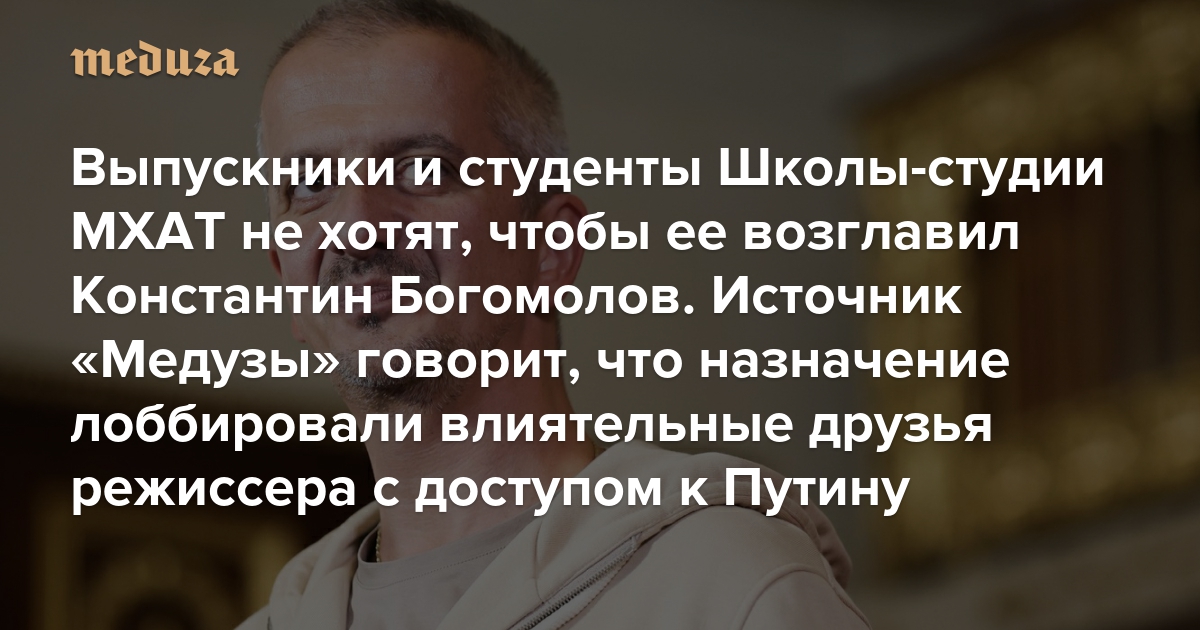 Выпускники и студенты Школы-студии МХАТ не хотят, чтобы ее возглавил Константин Богомолов Источник «Медузы» говорит, что назначение лоббировали влиятельные друзья режиссера с доступом к Путину