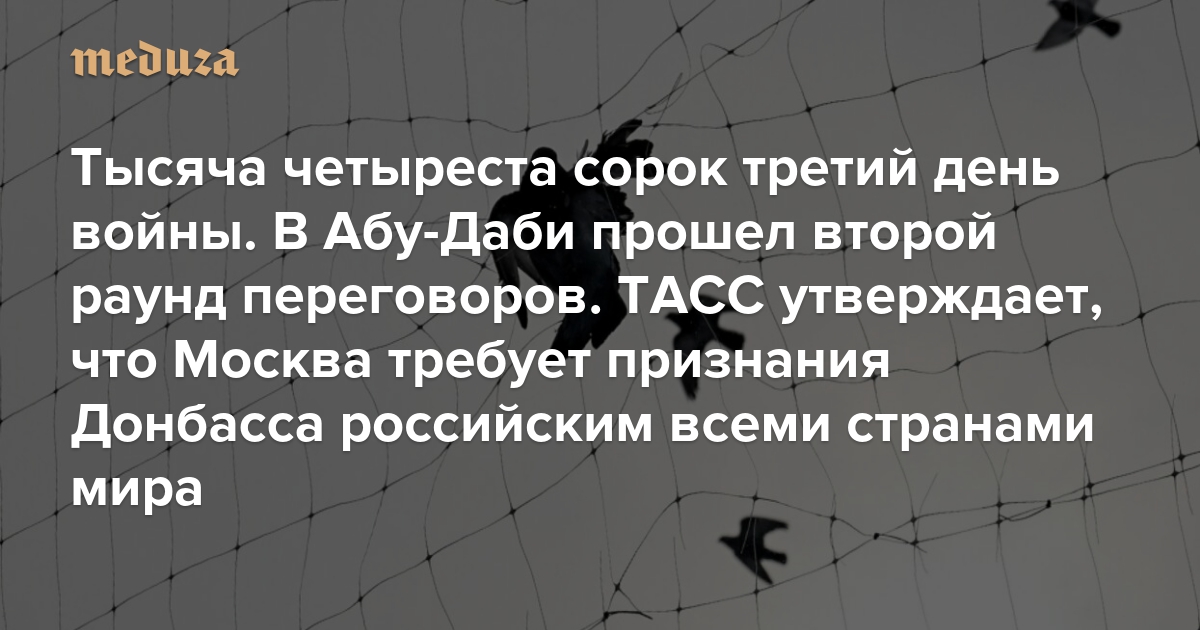Война Тысяча четыреста сорок третий день. В Абу-Даби прошел второй раунд переговоров. ТАСС утверждает, что Москва требует признания Донбасса российским всеми странами мира