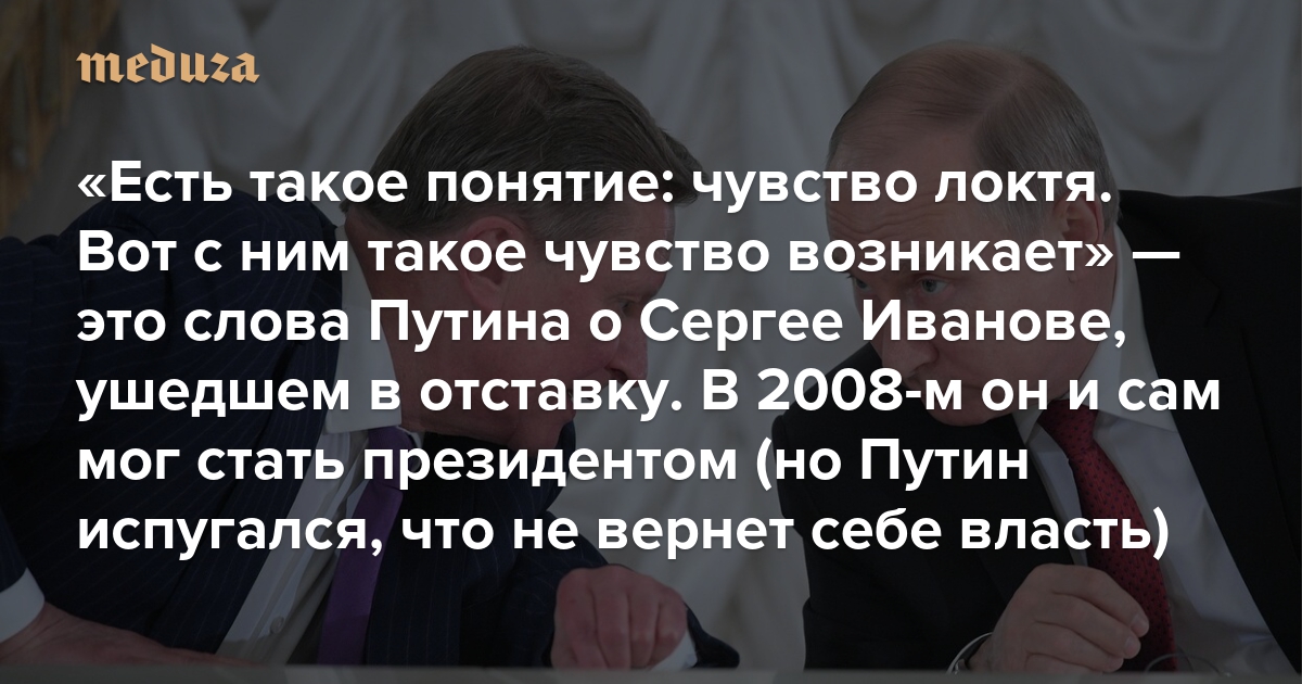 «Есть такое понятие: чувство локтя. Вот с ним такое чувство возникает» Это — слова Путина о Сергее Иванове, ушедшем в отставку. В 2008-м он и сам мог стать президентом (но Путин испугался, что соратник не вернет ему власть)
