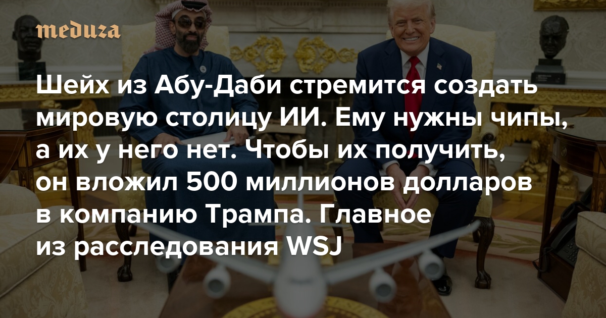 Шейх из Абу-Даби стремится создать мировую столицу ИИ. Ему нужны чипы, а их у него нет. Чтобы их получить, он вложил 500 миллионов долларов в компанию Трампа Главное из расследования The Wall Street Journal
