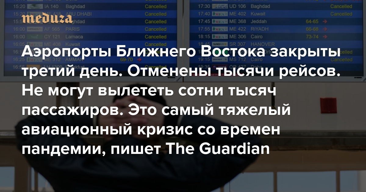 Аэропорты Ближнего Востока закрыты третий день. Отменены тысячи рейсов. Не могут вылететь сотни тысяч пассажиров Это самый тяжелый авиационный кризис со времен пандемии, пишет The Guardian