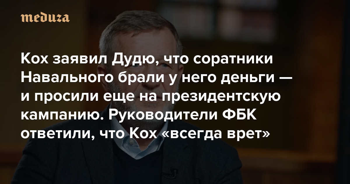 Кох заявил Дудю, что соратники Навального брали у него деньги — и просили еще на президентскую кампанию. Руководители ФБК ответили, что Кох «всегда врет» «Никаких „денег Коха“ Навальный не брал»