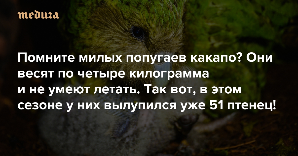 Помните милых попугаев какапо? Ну, тех, что весят по четыре килограмма и не умеют летать. Так вот, в этом сезоне у них вылупился уже 51 птенец! Это много — а будет еще больше. Как удалось спасти птиц от вымирания?