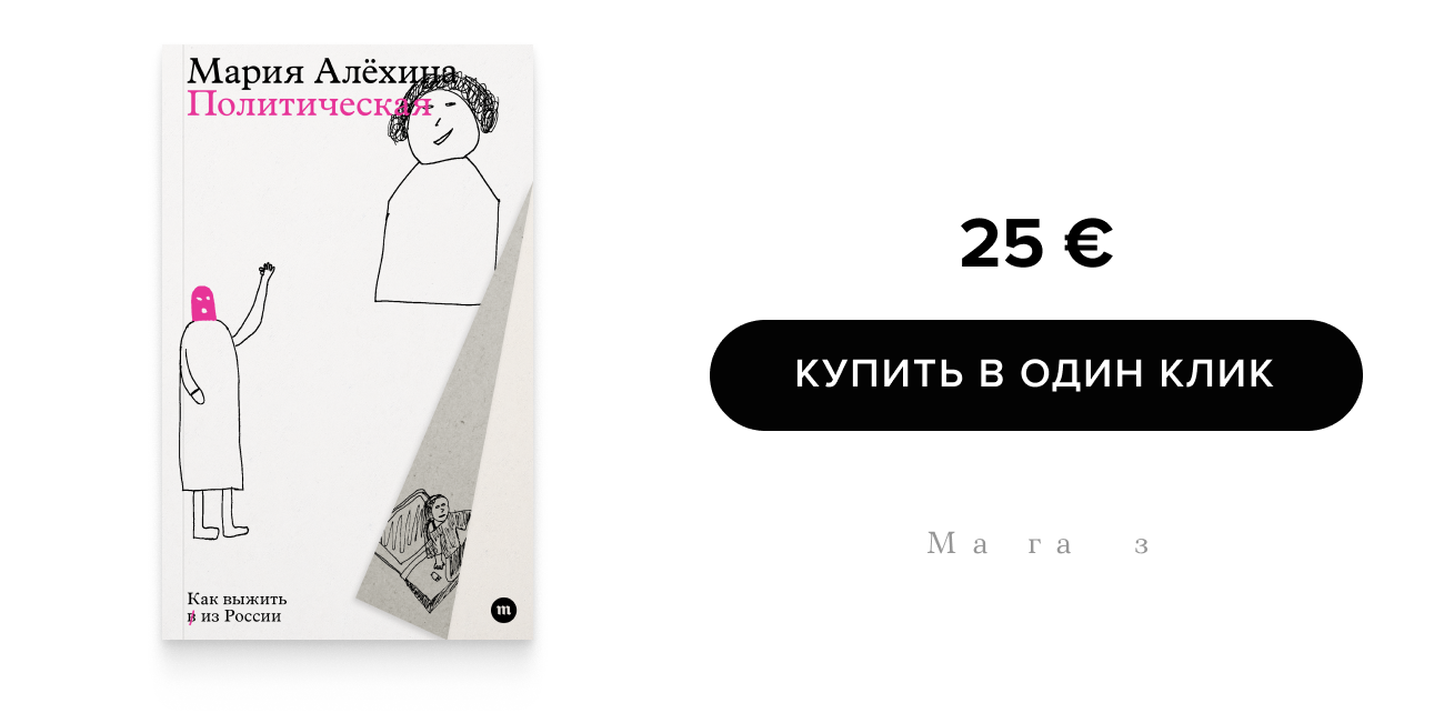 В книге «Политическая. Как выжить в из России» (вышла в издательстве «Медузы») активистка и участница Pussy Riot Мария Алехина рассказывает, как она провела в России последние предвоенные годы и первые месяцы войны. Радужный флаг на Лубянке, акция в кокошнике у Кремля, «карусельные» аресты и заключение — все это есть в «Политической». Финальная точка книги — побег из России весной 2022 года: Мария Алехина, переодевшись в спецодежду курьера, смогла скрыться от московской полиции и добраться до границы с Беларусью, а уже оттуда попала в Евросоюз. «Медуза» публикует фрагмент «Политической» — о решении покинуть страну и о подготовке к побегу.