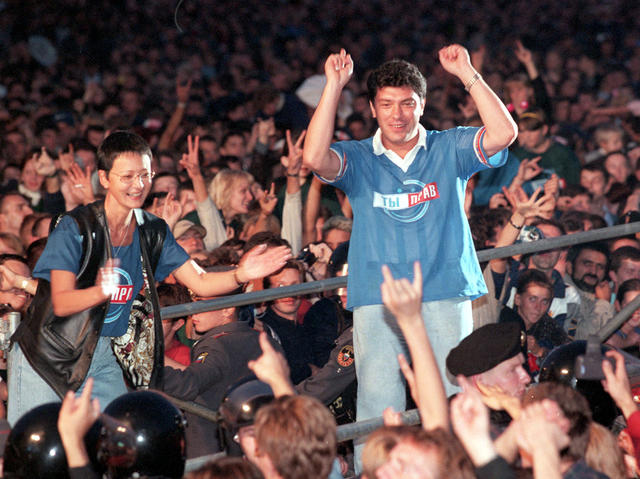 Ирина Хакамада («Общее дело», слева) и Борис Немцов («Россия молодая») среди молодежи на концерте «Ты — прав», Красная площадь, Москва, 29 августа 1999 года