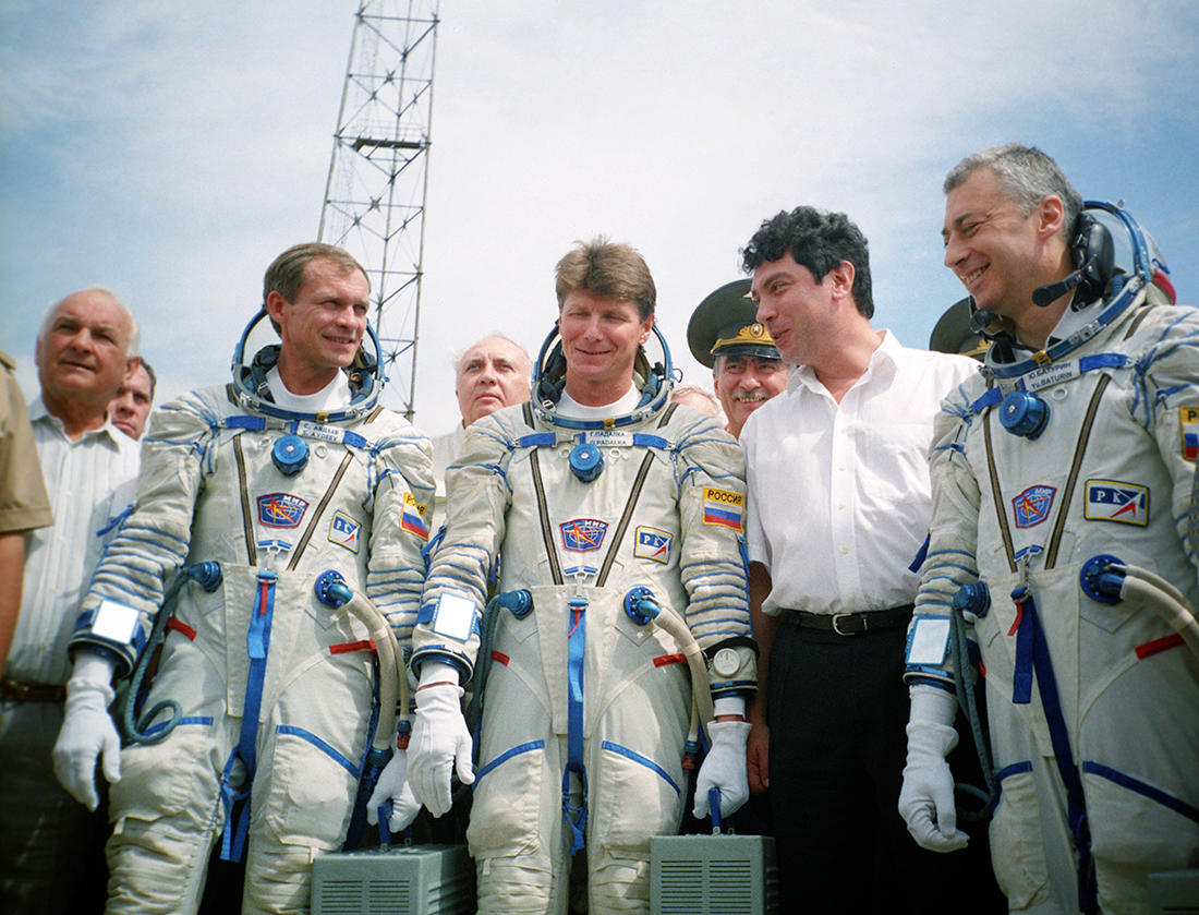 Проводы космонавтов в полет. Слева направо: бортинженер Сергей Авдеев, командир экипажа Геннадий Падалка, заместитель председателя правительства РФ Борис Немцов и космонавт-исследователь Юрий Батурин, Байконур, 13 августа 1998 года