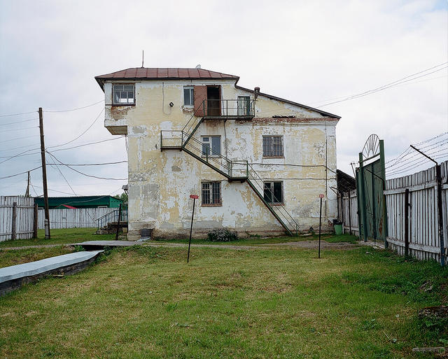 Жилой барак на территории участка особого режима. Забор слева дополнительно закрывал вид из зарешеченных окон