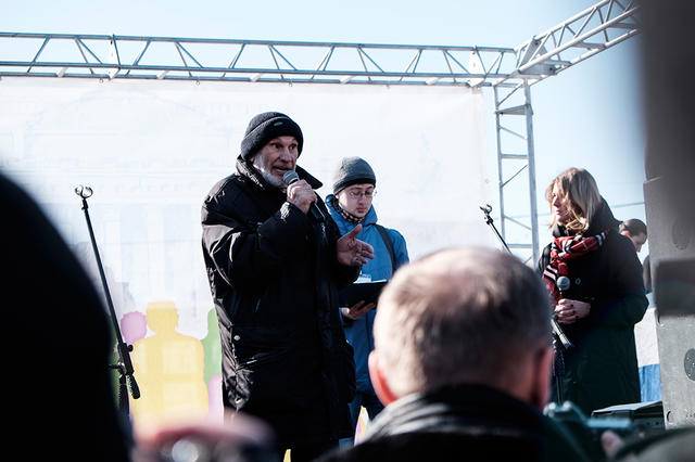 Писатель-фантаст Геннадий Прашкевич выступает на митинге «За свободу творчества» в Новосибирске