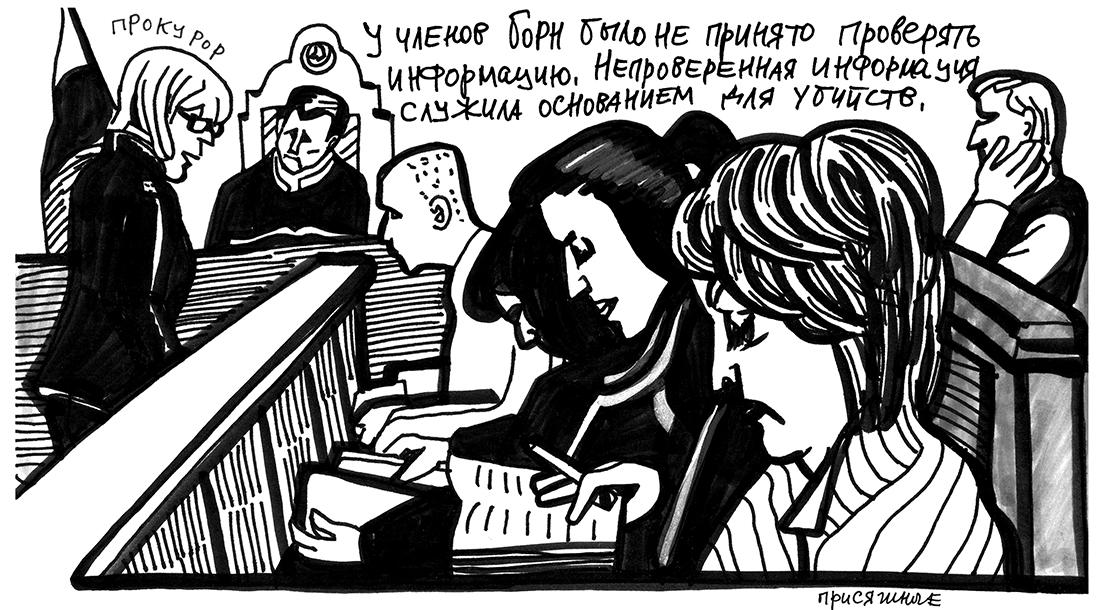 В показаниях подсудимых было довольно много противоречий. Судья Козлов то и дело обвинял их в попытке выгородить себя и уйти от ответственности. Одна из основных их мыслей заключалась в том, что БОРНа не существовало. Волков, в частности, упорствовал в том, что саму аббревиатуру он услышал уже после того, как совершил преступления.