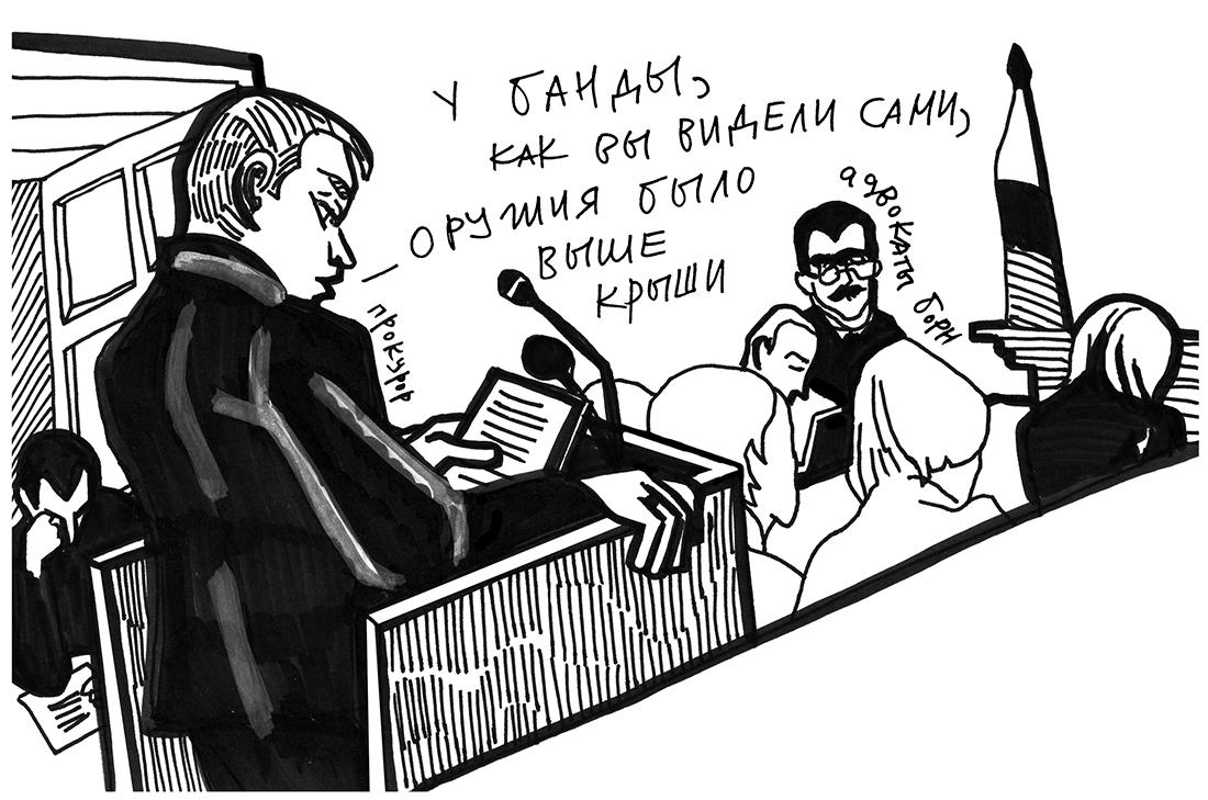 Заседание, в ходе которого обозревались улики — изъятое у банды оружие, — походило на экскурсию в какой-нибудь тематический музей. Участники БОРНа использовали обрезы охотничьих ружей и пистолеты, произведенные в начале ХХ века. К ним в руки они попали, видимо, через тех, кто занимается нелегальными раскопками.