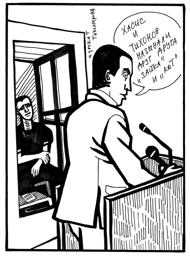 Никита Тихонов и его гражданская жена Евгения Хасис дали самые подробные показания на участников БОРНа, доведя последних до нескрываемого раздражения. Тихонов отбывает пожизненное заключение за убийство адвоката Станислава Маркелова и журналистки Анастасии Бабуровой. Хасис — 18-летний срок за соучастие. В кулуарах адвокаты не исключали, что Тихонов берет на себя даже больше, чем сделал, чтобы находиться в московском СИЗО — по месту расследования преступлений, а не в заполярной тюрьме для пожизненных с запредельно плохими бытовыми условиями. Хасис же просто хочет выйти пораньше.
