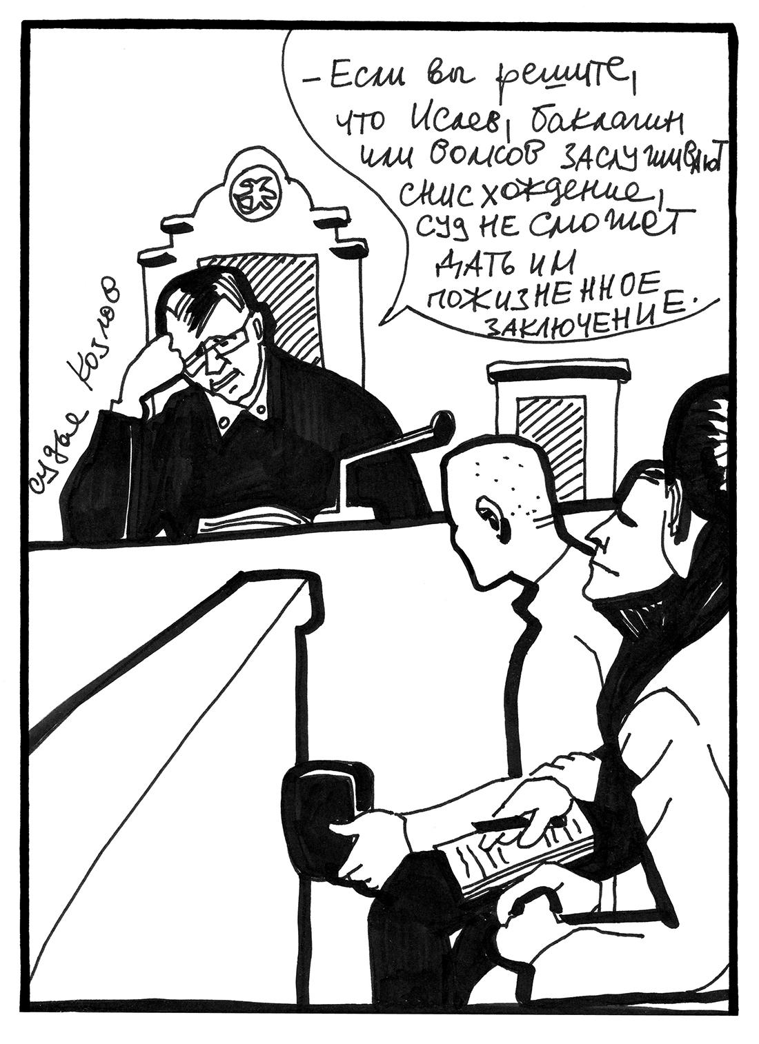 Процесс вел судья Мособлсуда Александр Козлов. В целом, он был исключительно корректен и подчеркнуто вежлив. «Я все понимаю, национализм, но зачем убивать-то было?» — спросил он однажды. При Козлове нельзя было делать только одного — говорить, что уголовное дело имеет очевидный политический подтекст, что ультраправые через цепочку посредников общались с людьми из Администрации президента — и что сам проект БОРН мог быть придуман не без их участия. Козлов беспощадно пресекал все попытки говорить об этом.