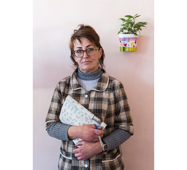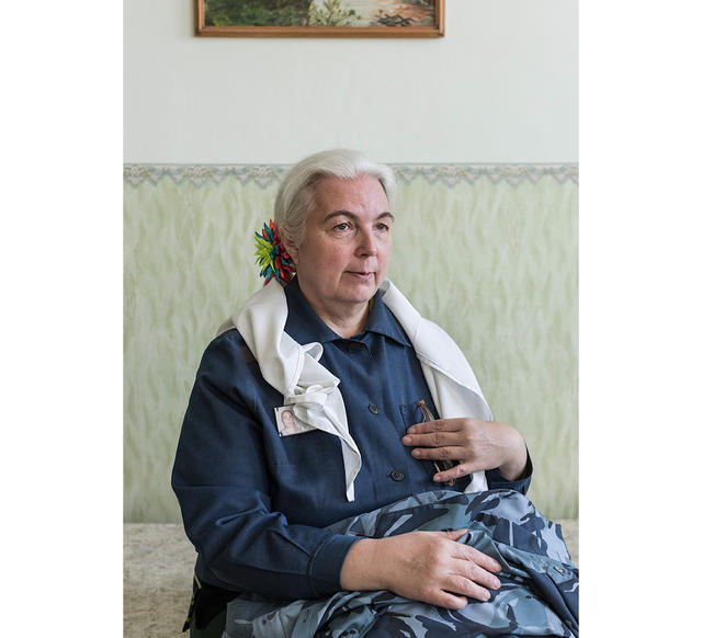 Наталья, родилась в 1962-м, колония для осужденных впервые, срок — 9 лет. Сфотографирована в отделе опытных образцов швейного производства, работает швеей технологического отдела. В руках у Натальи экспериментальный образец полицейской формы. Украшение в волосах — один из подарков от внучки.