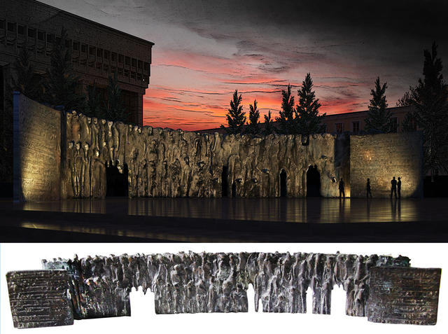 «Стена скорби» — победитель конкурса. Монумент представляет собой двухсторонний рельеф из фигур, стремящихся ввысь; просветы в форме силуэтов оставляют место для тех, кто уцелел. В комплексе также есть «плачущие» камни — по ним должна сочиться вода.