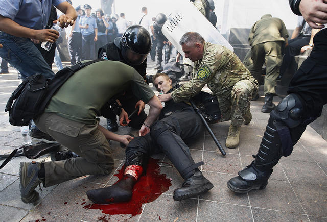 Полицейские оказывают помощь пострадавшему от взрыва гранаты на митинге возле здания Верховной Рады. В день митинга в парламенте обсуждалось предоставление особого статуса восточным областями Украины.