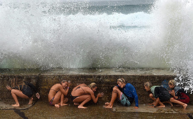 Люди укрываются от волн во время тропического шторма Марша. Циклон, обрушившийся на восточное побережье Австралии, причинил ущерб на общую сумму в 590 миллионов долларов США.