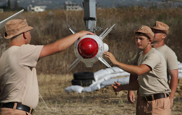 Российские военные подвешивают ракету Х-25 к самолету Су-24 на авиабазе «Хмеймим» в Сирии, 4 октября 2015 года. С начала военной кампании Россия использует в Сирии новейшие вооружения. К нанесению ударов подключены корабли ВМФ и силы дальней авиации.