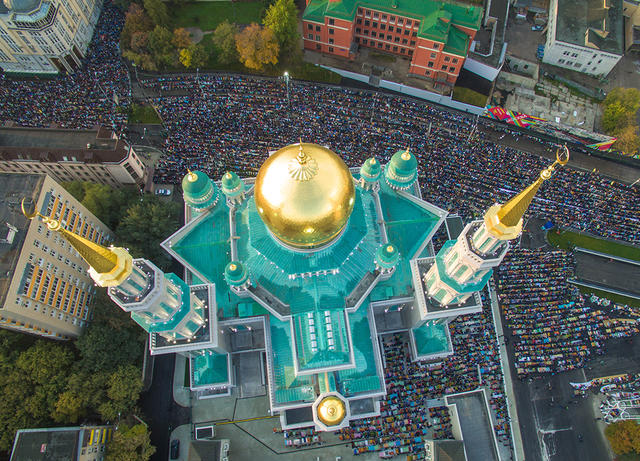 Мусульмане молятся в день праздника жертвоприношения Курбан-байрам у Московской Соборной мечети. Мечеть была открыта после десятилетней реставрации накануне — 23 сентября.