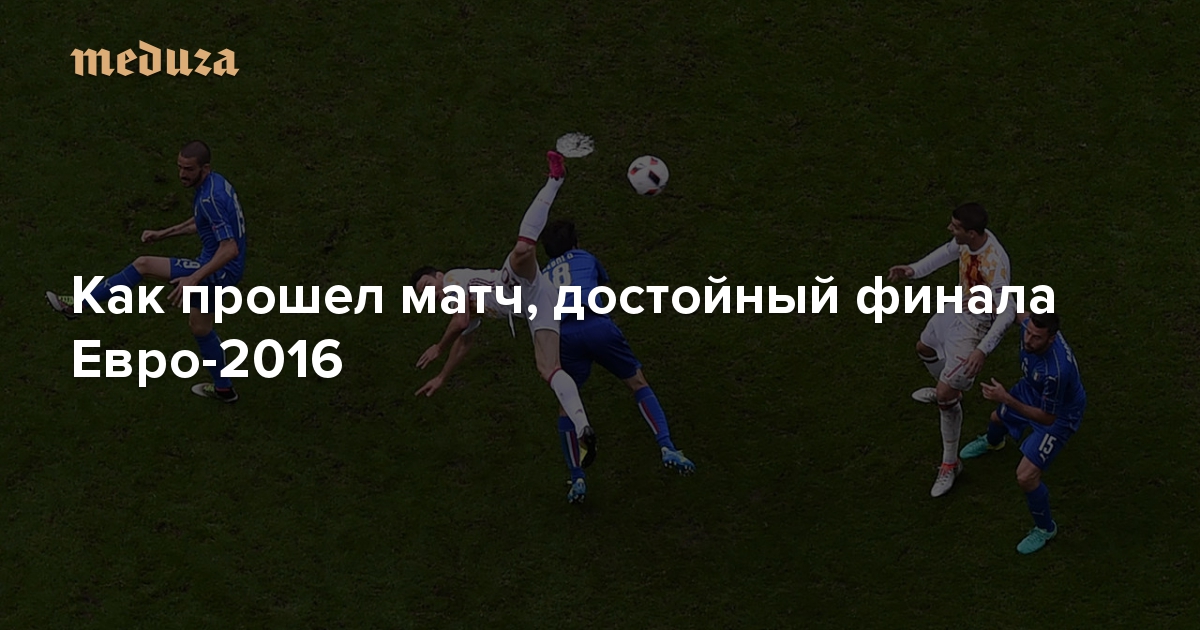 В 1/8 финала чемпионата Европы по футболу встретились Италия и Испания. Эти команды — одни из самых сильных сборных турнира, матч с их участием украсил бы даже финал Евро-2016. «Медуза» в режиме онлайн следила за тем, как итальянцы выбили испанцев с турнира.