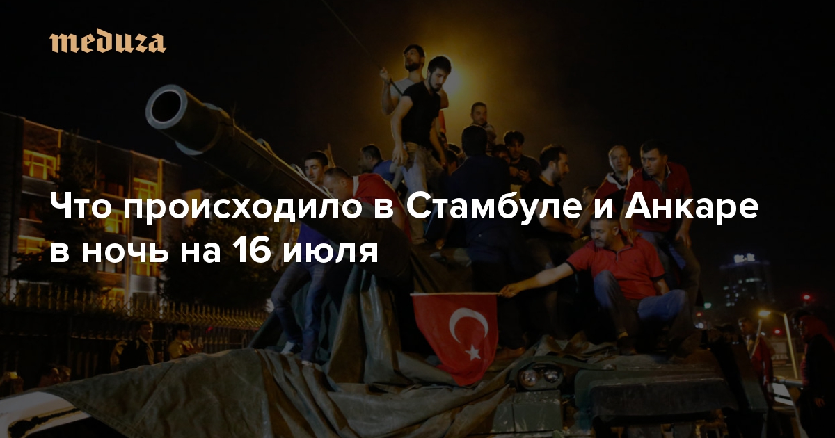 В ночь на 16 июля в Турции произошла попытка государственного переворота. Переворот в итоге не состоялся, хотя военные поначалу заняли здание, в котором размещаются несколько СМИ, а также мосты через Босфор. «Медуза» следила за ситуацией в онлайн режиме в течение всей ночи.
