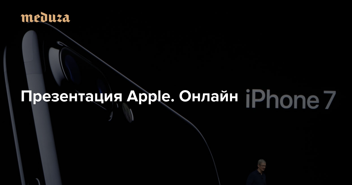 Вечером 7 сентября Apple провела презентацию новых продуктов. Корпорация представила iPhone 7 и 7 Plus — водонепроницаемые и без порта для наушников. Кроме того, на презентации анонсировали новую модель часов Apple Watch и беспроводные наушники Apple AirPods. «Медуза» вела прямую трансляцию мероприятия.