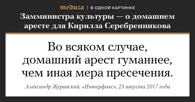 23 августа Басманный суд Москвы отправил режиссера Кирилла Серебренникова под домашний арест. Серебренников обвиняется в хищении 68 миллионов рублей, которые государство выделило на театральный проект «Платформа». К зданию суда его пришли поддержать сотни человек. За Серебренникова поручились Наталия Солженицына, Ирина Прохорова, Чулпан Хаматова и другие, но суд к ним не прислушался.
