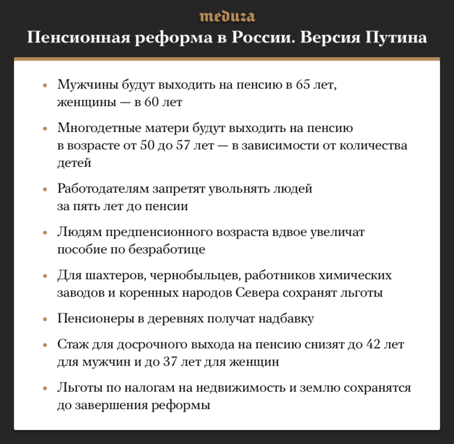 Что объявил: Пенсионный возраст повысят. Но будут некоторые послабления. Например, женщин отпустят на пенсию в 60 лет, а многодетных матерей еще раньше. Возраст получения пенсионных льгот сохранят на действующем уровне. Людей предпенсионного возраста запретят увольнять