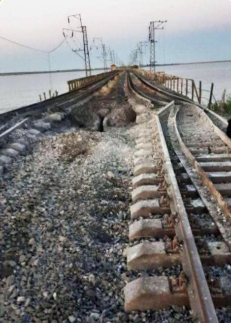 - Генический мост через пролив Тонкий, соединяющий Геническ с Арабатской стрелкой, попал под обстрел одновременно с Чонгарским.