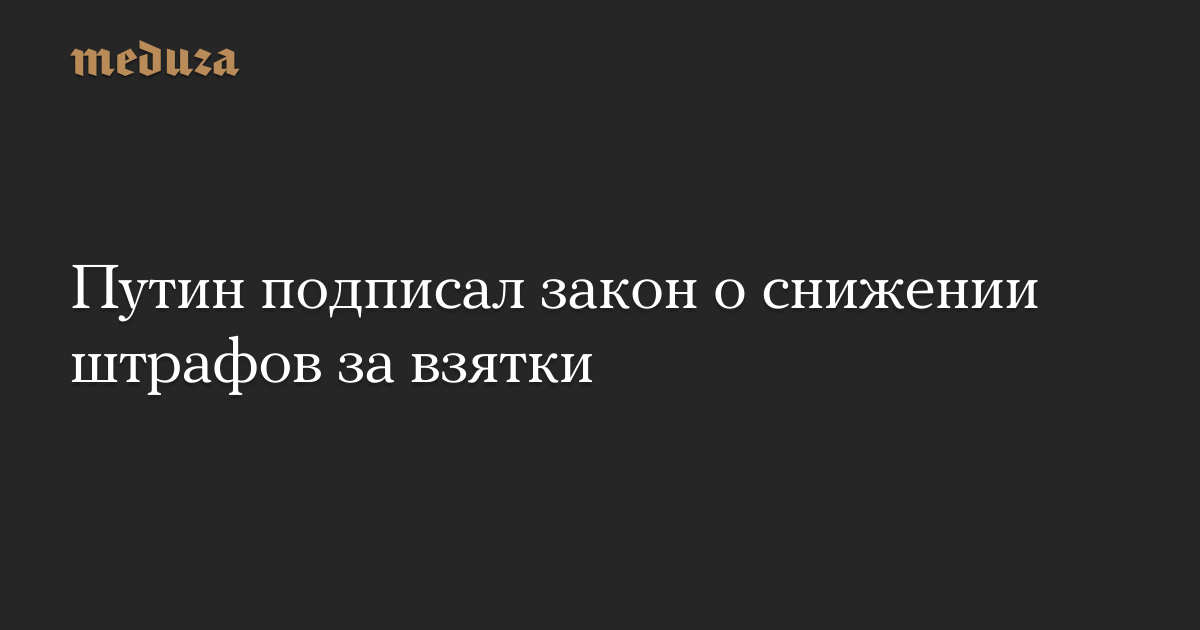 Президент РФ Владимир Путин подписал федеральный закон, снижающий минимальные штрафы за получение взятки. Документ опубликован на официальном интернет-портале правовой информации.