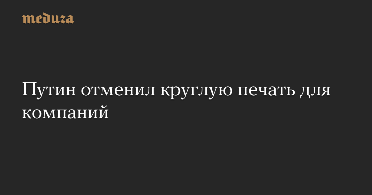 Президент России Владимир Путин подписал закон, который избавляет компании от необходимости иметь круглую печать. Как пояснило государственно-правовое управление президента, наличие печати «является правом, а не обязанностью хозяйственных обществ».