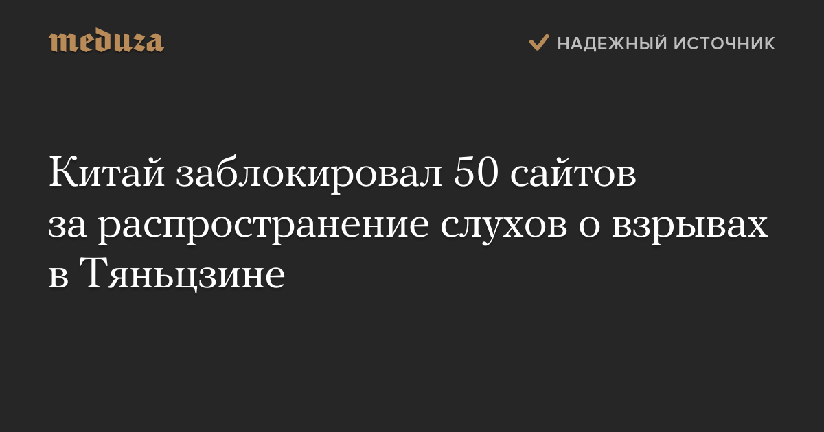 Китайский интернет-регулятор заблокировал 50 сайтов за распространение слухов о взрывах на складе в Тяньцзине. 18 ресурсов закрыты, у их владельцев отозваны лицензии. Работа 32 сайтов временно приостановлена.
