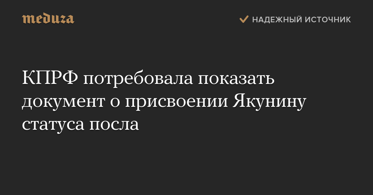 КПРФ потребовала показать документ о присвоении Якунину статуса посла
