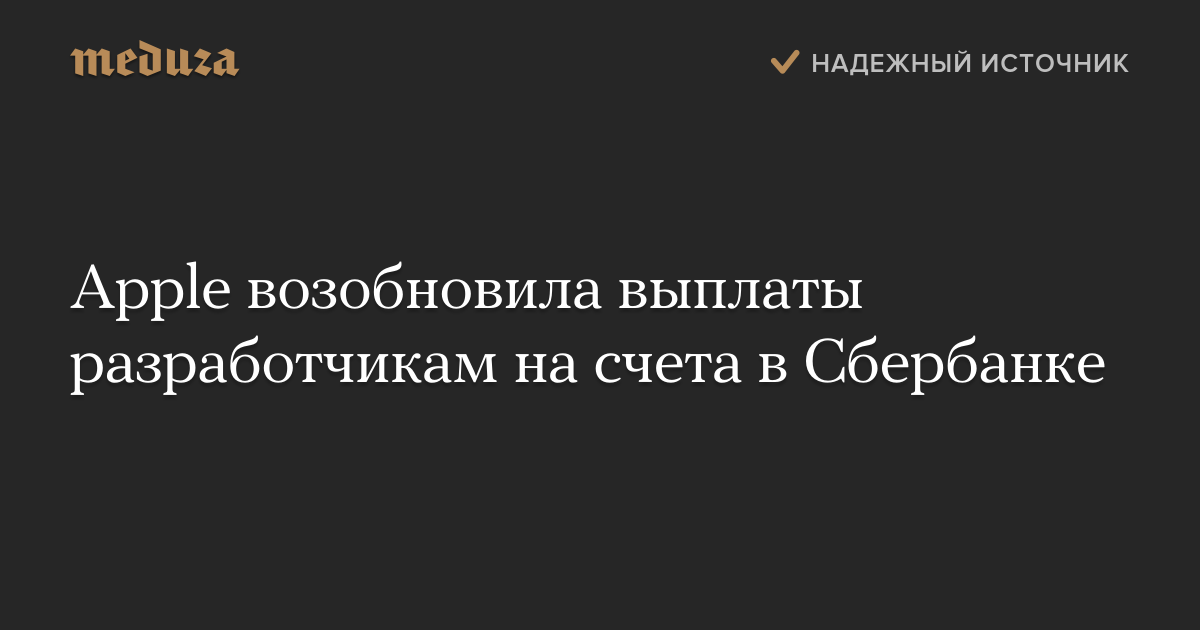 Компания Apple возобновила перечисление партнерских выплат российским разработчикам приложений для OS X и iOS на счета в Сбербанке. Об этом сообщила пресс-служба Сбербанка, а также подтвердили разработчики.