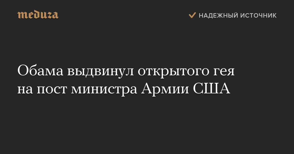 Президент США Барак Обама выдвинул кандидатуру Эрика Фаннинга, который является открытым геем, на пост министра Армии США. Фаннинг с июня 2015 года занимает должность заместителя министра.