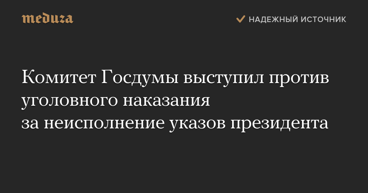 Комитет Госдумы по гражданскому, уголовному, арбитражному и процессуальному законодательству рекомендовал отклонить законопроект, предусматривающий уголовное наказание за неисполнение или ненадлежащее исполнение указов, распоряжений и поручений президента России.