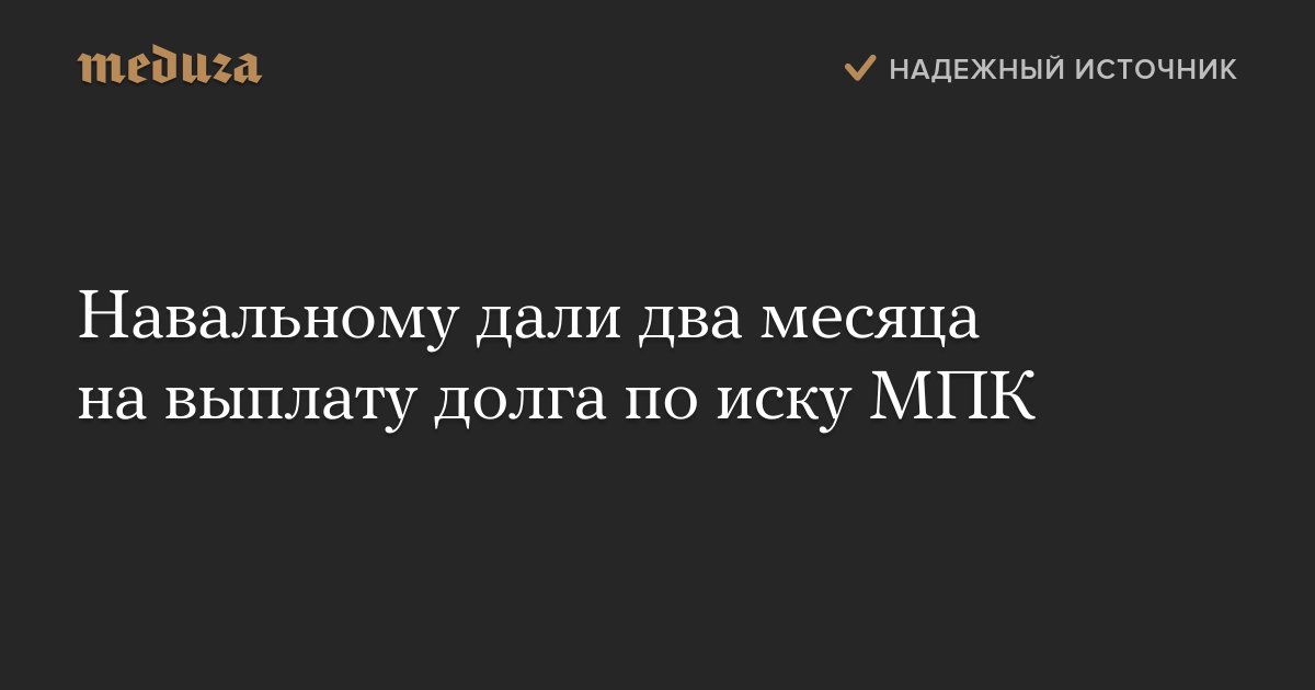 Замоскворецкий суд Москвы предоставил Алексею Навальному рассрочку на выплату долга по гражданскому иску «Многопрофильной процессинговой компании». Как сообщила пресс-секретарь ФБК Кира Ярмыш, рассрочка предоставлена на два месяца вместо пяти, о которых просил Навальный.