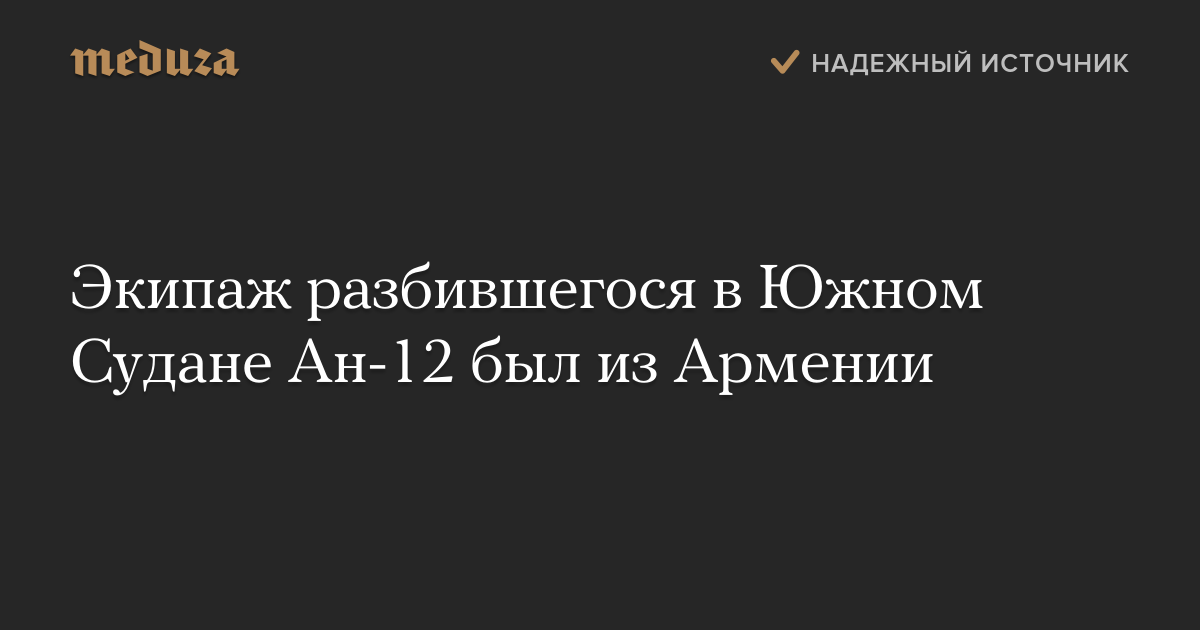 МИД Армении подтвердил гибель пятерых граждан страны в авиакатастрофе Ан-12 в Южном Судане. Все они были членами экипажа. Ранее сообщалось, что экипаж состоял из граждан РФ.